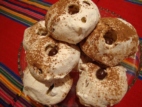 The recipe was from Betty Crocker’s Picture Cook Book, and in the list of ingredients I came across something I’d never heard of: Cream of tartar. What was it? My parents didn’t know, and our landlady who lived upstairs and baked, wasn’t home. So I asked a family friend who was visiting what he thought it might be. He said he knew of tartar sauce and that it was made with mayonnaise and that maybe I could try that. Not knowing what else to do, I plopped in ¼ teaspoon from our Best Foods jar and beat away. And beat, and beat, and nothing happened. The whites just refused to whip. I learned later how fat prevents the egg white proteins from joining together and forming air cells. But at the time I just cried, and threw out the mess. When our landlady came home she told me cream of tartar was an acid powder that stabilized egg whites and that I could buy it at the grocery store. I ran off to buy it, and my next try at meringue kisses drew raves. Over the years I’ve modified the basic recipe into something more dramatic. Here it is.