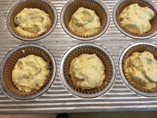The finished batter. After the last of the flour was stirred in the batter became completely smooth. The little bumps in the batter are the black walnuts. The batter's ready to be divided into the cupcake pan lined with paper cups.