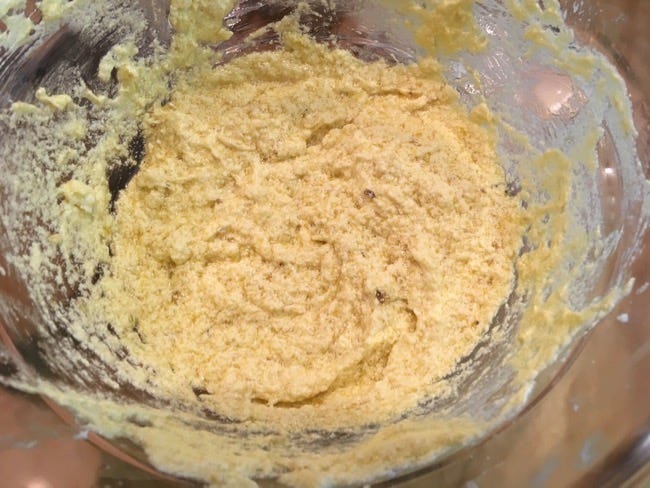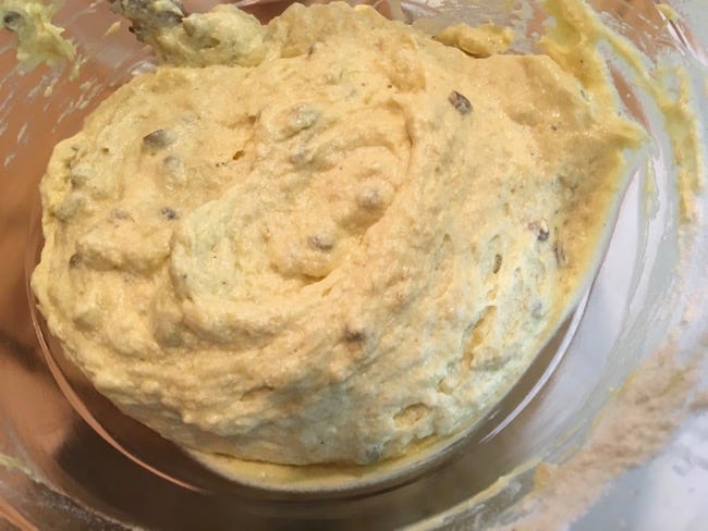 Oops! What happened. After beating in the banana the batter has a curdled look. But don't worry, all will be well later.