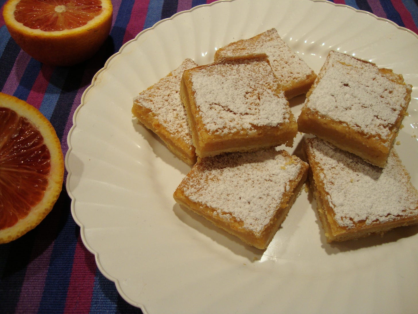 I happen to love homey, old-fashioned desserts. And in the winter I often bake a batch or two of Lemon Squares. A few days ago I found a huge display of blood oranges at my market and decided I’d try substituting their juice and zest for the lemons. I’ve always loved drinking blood orange juice with breakfast, a habit we got into when living in Italy. At the time, our two sons were very young, and during the winter in Naples we had a contest each morning to see which of us had the glass with the reddest orange juice. We’d each select uncut oranges from the bowl and either my wife or I would be the designated squeezer. The suspense was always exciting. At the last moment, when it seemed one of us was the clear winner, the last orange would be so red a surprise winner won the day. And the prize? Getting first pick of the oranges for the next day’s contest.