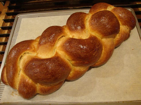 You begin by making a “sponge,” a mixture of flour, yeast, and water, that results in the production of more yeast cells and begins the development of the bread’s flavor. The resulting bread is moist and tender and is delicious plain or spread with butter. Challah makes excellent sandwiches, toast, and when a day or two old, sensational French toast. Follow the step-by-step photos for the braiding. Here’s an excellent video clearly illustrating how to braid a 4-stranded challah. When I discovered the YouTube video, I’d pause it after every move, rush into the kitchen across the hall from my study, perform the maneuver I’d just seen, and repeat going to my computer, then the kitchen, until I’d shaped the loaf. http://www.youtube.com/watch?v=4RvoqkYaUWo. Note on measuring flour: Dip dry measuring cup into flour container, fill the cup to overflowing, and sweep off the excess with a straight edge to level the contents of the cup. Don’t shake or bang the cup. One cup of flour measured this way weighs 5 ounces (140 grams).