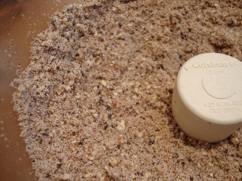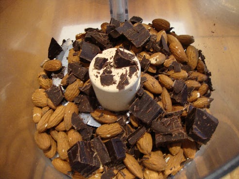 Add the sugar and process about 1 minute, until the nuts and chocolate are finely ground. Stop once or twice to scrape the sides of the work bowl.