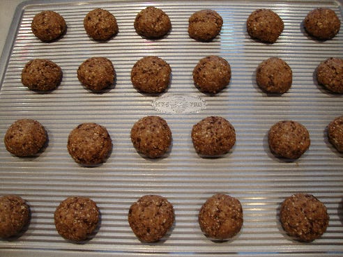 You’ll need a large cookie sheet—14 x 18 or 14 x 17-inches. I recently discovered the USA Pan cookie sheet, which has a ribbed surface and is nonstick. I can set the balls of dough right on the sheet—no greasing and no pan liners—and after the cookies have cooled for about 15 minutes, they’ll come right off. (Full disclosure: I have no commercial relationship with USA Pan. I just like their products).