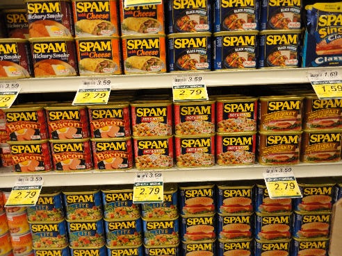 Spam is one of the most popular Hawaiian foods. Really. Just go into any supermarket in the state and you’ll find huge displays of the stuff in all sorts of flavors. There’s even a Lite version.