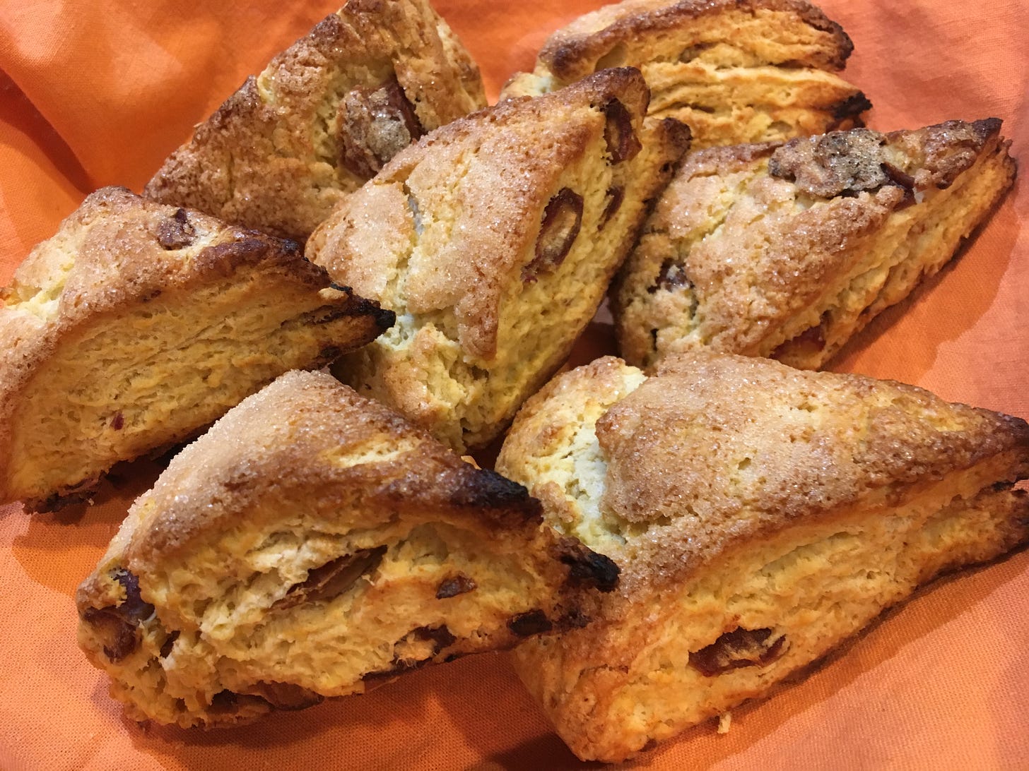 As a lifelong lover of dates—one of the sweetest of dried fruits—I wanted to see if they could supply enough sweetness so that I could cut back on the sugar in my scones. The short answer is “Yesssssss!” Instead of the 1/3 cup sugar I’ve been adding to the dough, I now use 1 1/2 tablespoon plus a splash of vanilla. I sprinkle another 1/2 tablespoon sugar on the scones’ tops for some crunch.