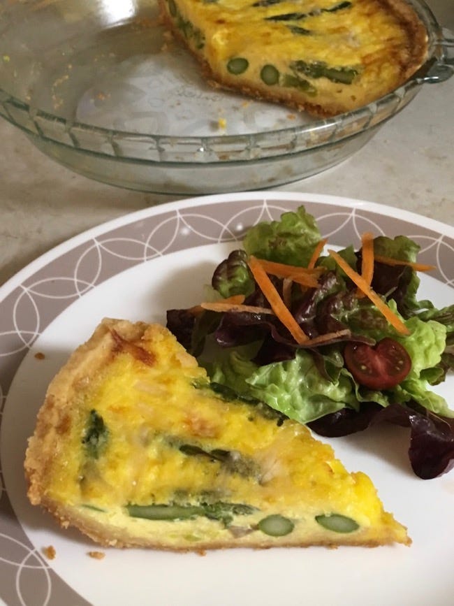 Asparagus needs a brief pre-cooking before it goes into a quiche. While baking it becomes completely tender. One really quick way to prep the asparagus is in a microwave. Snap the ends off a pound of asparagus and put the spears into a microwave-safe dish. Cover tightly with a lid or with plastic wrap and microwave on high for 3 minutes. After cooling, cut the spears as directed in the recipe and they’re ready to bake in the quiche.
