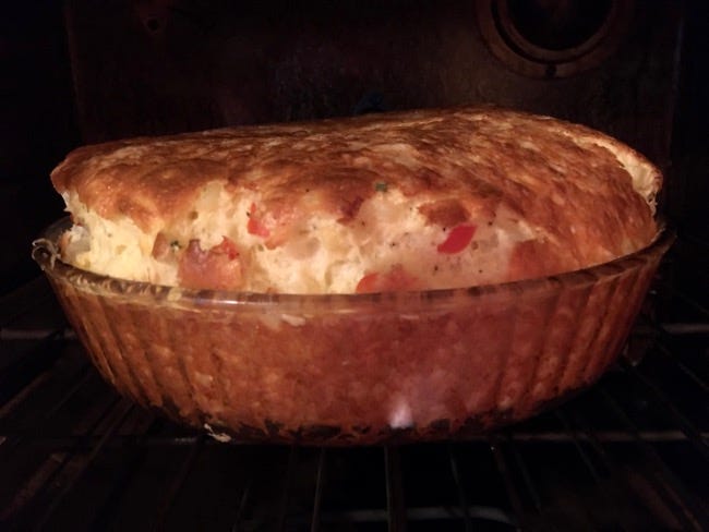 Because local corn is in season right now, you should try your hand at this recipe. If you’ve not made a soufflé before, please don’t worry. All you’re doing is whipping up egg whites in a grease-free metal bowl until they’re light and fluffy and thick enough to hold their shape without falling out of the beating bowl when you turn the bowl upside down—yes, that’s the surest way of knowing you’ve beaten the whites properly. At that point they’re ready to become friends with the warm sauce base. Be sure to beat the whites until they reach this stage and no further. Soufflés rise so magnificently because of the air in the egg whites. The yolks go into the base to make it silky smooth and creamy. You fold—incorporate--the beaten whites into the sauce in stages with a large silicone spatula to get as much air as possible into the soufflé. Once you’ve folded in the corn and peppers, into the baking pan goes the batter, and then into the preheated oven. While in the oven—no peeking, please—the soufflé expands and rises to about double its height, and in thirty minutes your beautifully risen and browned creation will be ready to serve. Use that time while the soufflé bakes to clean up. You’ll have a skillet and a saucepan or two, and a few small bowls and other utensils that need washing. Once that’s all done, put a salad together, and you’ll be all set to dine. A little Sauvignon Blanc would be perfect with this soufflé. Bon appétit!