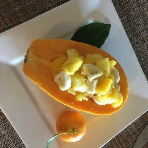 Greg's Hawaiian Breakfast Favorite: Papaya with slices of fresh pineapple and banana.