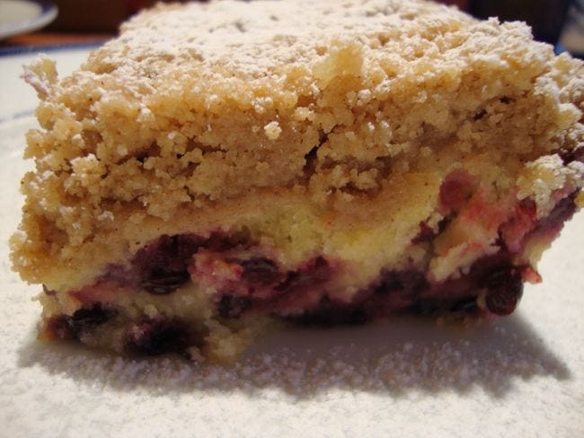 In a previous post I wrote about New York Style Crumb Cake. Here’s what I said: “There’s crumb cake and there’s coffee cake, and in New York never the twain shall meet. Crumb cakes get their name from their special topping—buttery pea-sized crumbs resting atop a fine-textured butter cake. You can drink coffee with crumb cake, of course, but don’t call it coffee cake, a non-specific descriptive of just about any kind of cake to enjoy with coffee.”