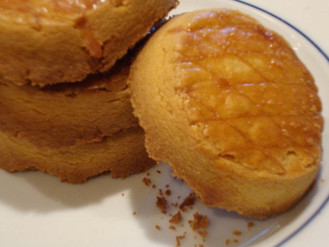 Here’s what you do. Put the flour into a mixing bowl and stir in some salt and confectioners’ sugar. Add the butter—cold—cut into pieces and work it into the flour with a pastry blender until the texture resembles small peas. A much easier way of doing this step is with a food processor. Add the egg yolks and work them in to form a stiff dough. Knead briefly and roll the dough 3/4-inch-thick between sheets of wax paper. Score the dough and cut into biscuits.