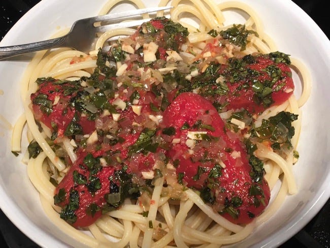 Tomato season is in full swing. Finally. And this pasta "sauce" of baked Roma tomatoes is simply sensational. I've adapted this recipe from “We Called It Macaroni,” by Nancy Verde Barr; Knopf, 1992). The beauty of this Neapolitan dish is that it requires practically no attention once the tomatoes are in the pan. The peppery heat alludes to Mount Vesuvius, which overlooks the Bay of Naples. Since the volcanic activity has simmered down, feel free to adjust the spiciness accordingly. The long baking at a low temperature gives the tomatoes a special sweetness.