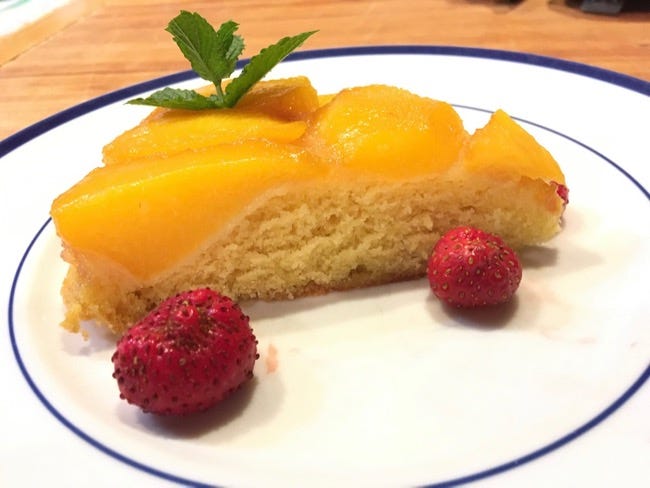Peach upside down cake. A caramel poured over the peaches before baking melts into and saturates the peaches during baking.