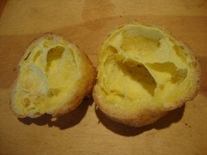 While we’re on the magic of air in baking, let’s consider the popover, those amazing mountainous puffs of crustiness and egginess. To make them you beat eggs, milk, and melted butter into flour and salt, pour the cream-like batter into deep pottery or metal cups, and bake them until they more than triple in volume and become beautifully browned with huge cavities in their middles. Heaven.