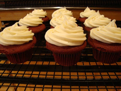 These crowd-pleasing cupcakes are as delicious as they look. The startling contrast between the crimson-colored cake and the white frosting just draws people in. The advantage of a cupcake over a slice of cake is that there's more frosting to cake ratio. Maybe that's why cupcakes are always a big hit, especially with kids.