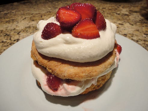 I usually make strawberry shortcake once a year when I find first-of-the-season berries in late June at our Missoula farmers’ markets. I split the just-baked rich buttery rounds of shortcake, fill them with lightly sugared berries and whipped heavy cream, top the cakes with more cream and berries, and eat away with a knife and fork.
